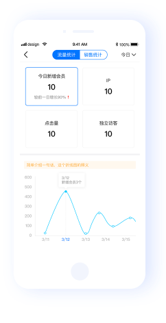 除日常訪問數據外,商家還(hái)可查看(kàn)訂單交易額、訂單量、會(huì)員(yuán)數、客單價等數據,讓您不登錄後台即可查看(kàn)銷售統計,及時制定銷售對策,捕捉商機(jī),提升訂單數量;